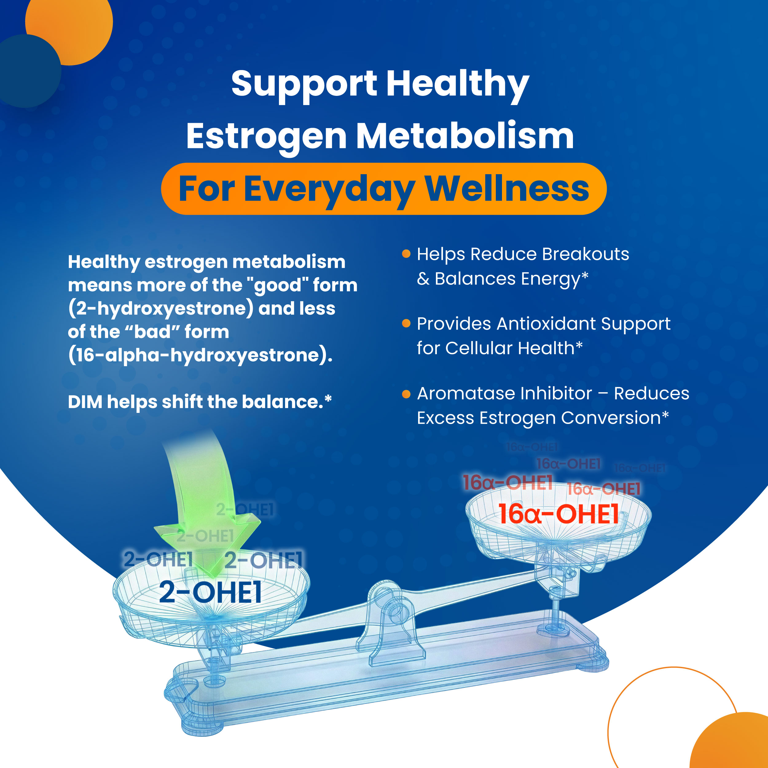 DIM is widely studied for its potential role in supporting healthy estrogen metabolism within the body.* Estrogen exists in multiple forms, and DIM is believed to support the body’s natural ability to maintain a balanced ratio of these forms.*